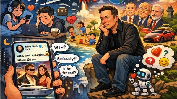 Z世代或千禧一代当中,有很多人每天刷着短视频平台、追着关键意见领袖的奢侈生活,却常常在凌晨三点纠结工作、关系和未来。可你能想像吗?马斯克,一个地球上最有钱的人,能随手买下太空船、富养一堆小孩,还能和各国大佬聊天,但他突然在X平台上发帖感慨:“钱买不到幸福”。他这个帖子一出,瞬间刷屏上亿浏览,网友们从吐槽到深思,热议不断。这个科技狂人内心到底在纠结啥?人工智能时代,幸福能靠科技“解锁”吗?